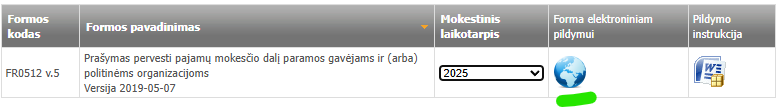 http://deklaravimas.vmi.lt/lt/Pradinis_Prisijungimo_puslapis/Prisijungimasprisorinessistemas.aspx - Pasirinkti formą FR0512 v.5. Dėmesio, formą FR0512 v.5 pildyti galima tik pateikus metinę deklaraciją. https://deklaravimas.vmi.lt/lt/Deklaravimas/Formu_teikimas/Paramos_skyrimas/Pildyti_nauja_forma.aspx